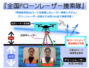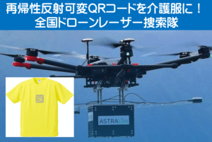 【NPO法人光探索協会】(大阪市、理事長:前田佳伸)は、東日本幹事企業のAPEX株式会社(東京都、代表:下戸優輔)および西日本幹事企業のSMGコンサルタント株式会社(山口市、代表:岡村文義)と協同して「全国ドローンレーザー捜索隊」を組織した。「再帰性反射可変QRコード」を介護服に装着しておけば、南海トラフ大震災の津波や迷子時にレーザー捜索が可能になる。また、可変QRコードには、写真やメッセージを何度でも自由に登録・書き換えが可能。症状をメッセージに書き込むことによって、スマホで読み込んでもらった方に伝えることができる。
