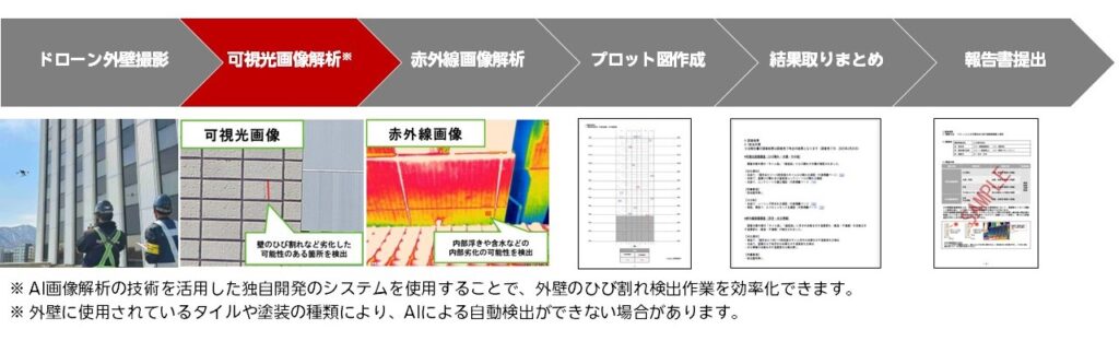 画像解析作業はドローンで撮影した可視光画像と赤外線画像の両方(注3)を用いるが、本システムでは、可視光画像の解析を行い、ひび割れの疑いがある箇所をAIによる画像解析で自動的に検出する。その後、専門スタッフによる目視確認も組み合わせることで信頼性を確保。さらに専門スタッフは、赤外線画像を基に温度差などの情報から内部浮きや含水などの内部劣化の可能性を解析する。これらの結果を基に、劣化箇所を整理して記載したプロット図を作成し、最終的な解析内容を体系的にまとめた報告書を提供する。なお、報告書の作成では、必要に応じて建築士による監修(注4)を組み合わせることも可能。本サービスの開発時に沖縄県那覇市にある大型商業施設「パレットくもじ」の外壁調査で行った検証では、本システムを使用しない場合と比較し、可視光画像の解析にかかる作業時間を約48%削減できると算出された(注5)。今後は自社で撮影した画像の解析だけでなく、ドローンによる外壁調査を実施する企業に対して、本システムを活用した画像解析作業から報告書の作成までを行うサービスの提供も予定している。