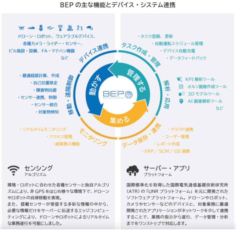 それによって、カスタマイズしたドローンやUGV(無人地上車両)を自律移動させ、人間の代わりに業務を担ってもらうサービスを提供しています。そしてサーバー側では、ドローンやUGVが取得したデータを保管し、お客様が見たいデータをいつでもすぐに取れるようにするための機能まで含めて提供しているのが、当社の「BEP」の大きな特徴となっています。